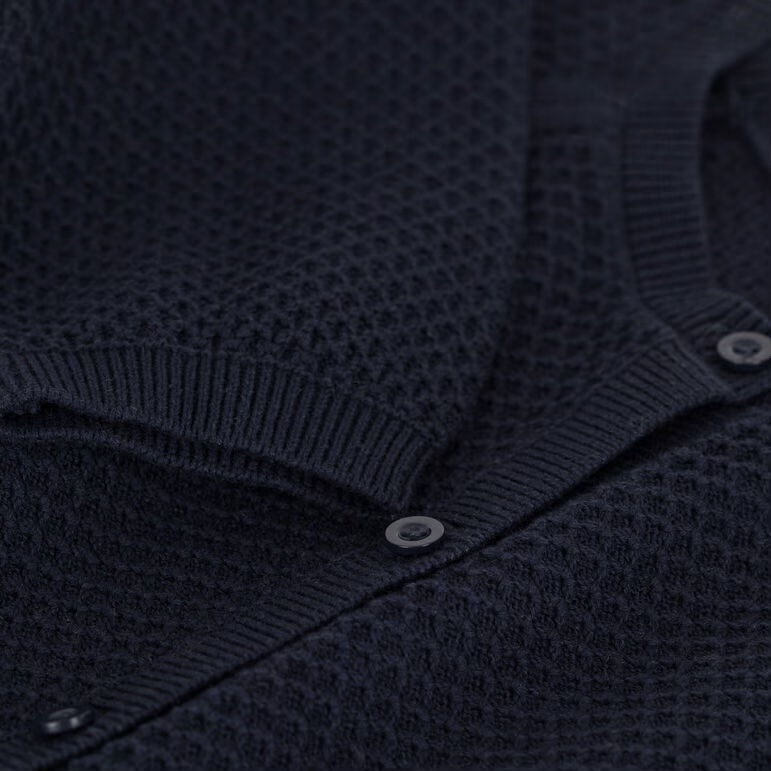 Ce cardigan bleu marine en maille texturée présente une coupe classique avec une encolure ronde et des manches raglan. C’est un basique intemporel et polyvalent, idéal pour compléter n’importe quelle tenue avec sobriété et confort.