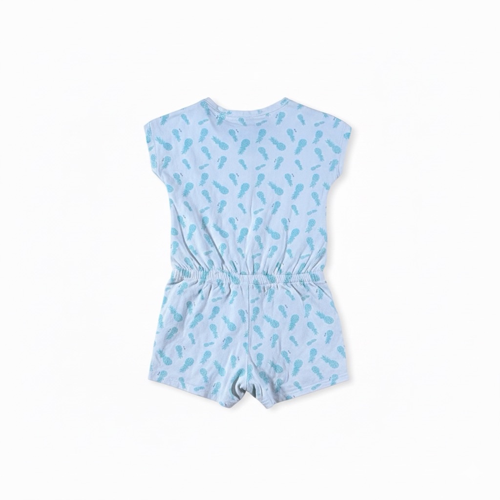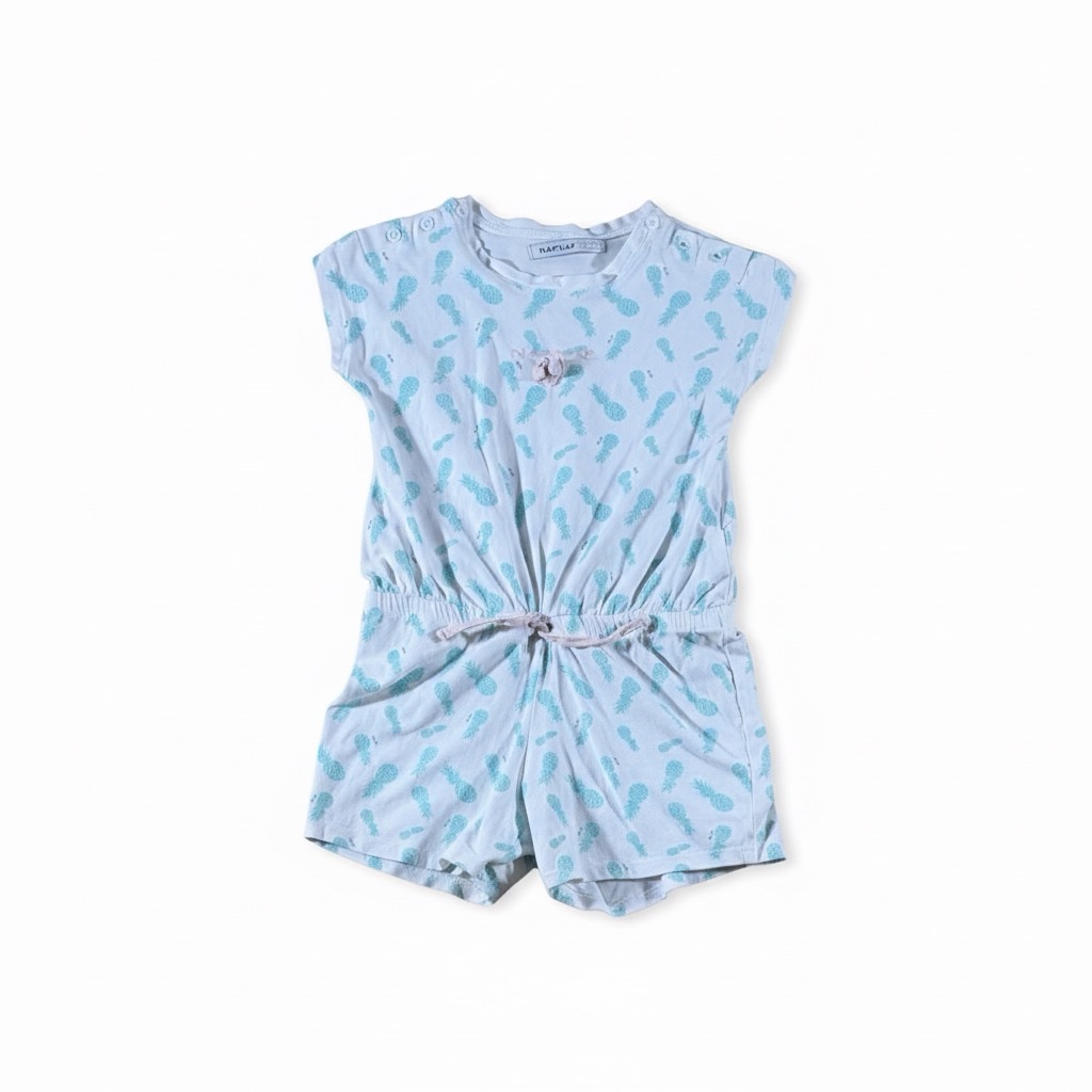 Combi-short Naf-Naf blanche, légère et parfaite pour l’été, décorée de jolis motifs fruités bleu clair. Confortable et facile à porter, elle offre un look frais, gai et adorable pour les journées ensoleillées.