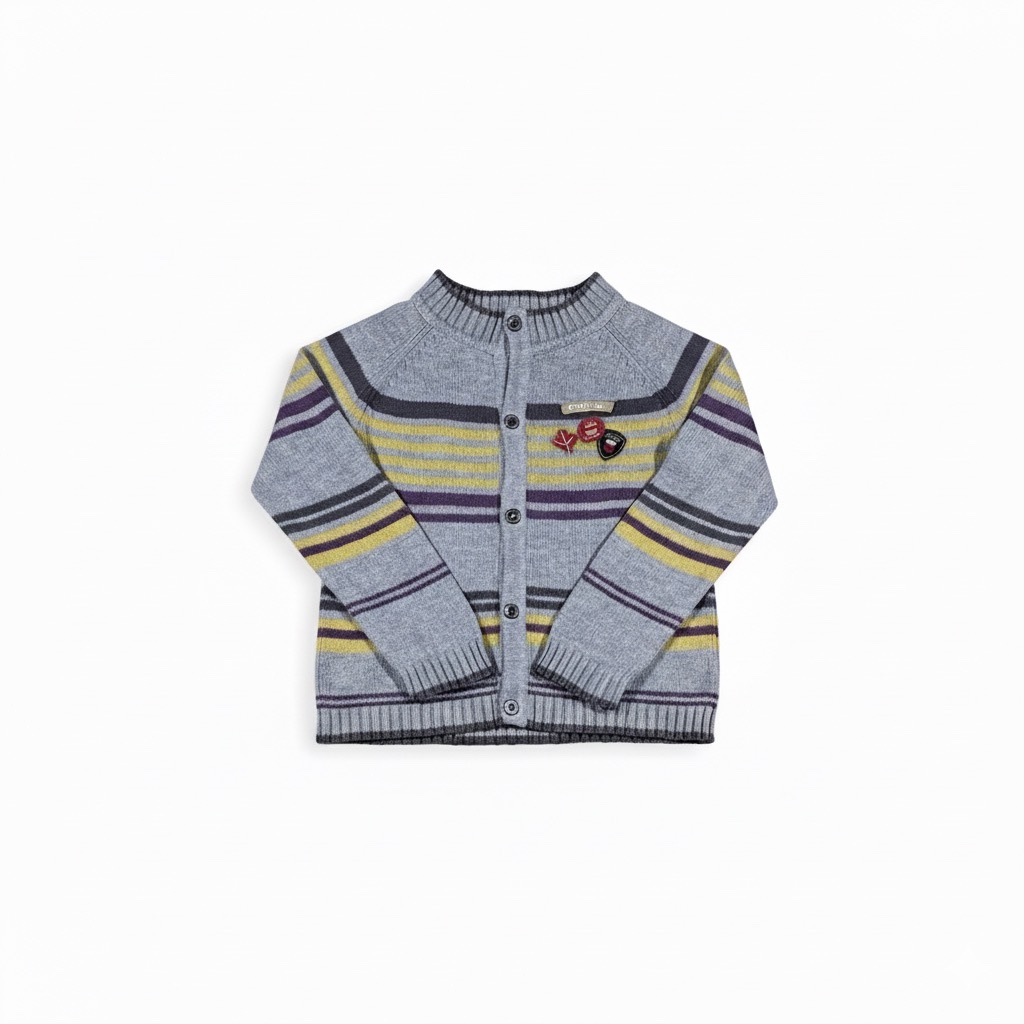 Gilet en tricot gris à rayures vives. Col montant, boutons contrastés, et écusson ludique. Le vêtement douillet et stylé pour un maximum de confort.