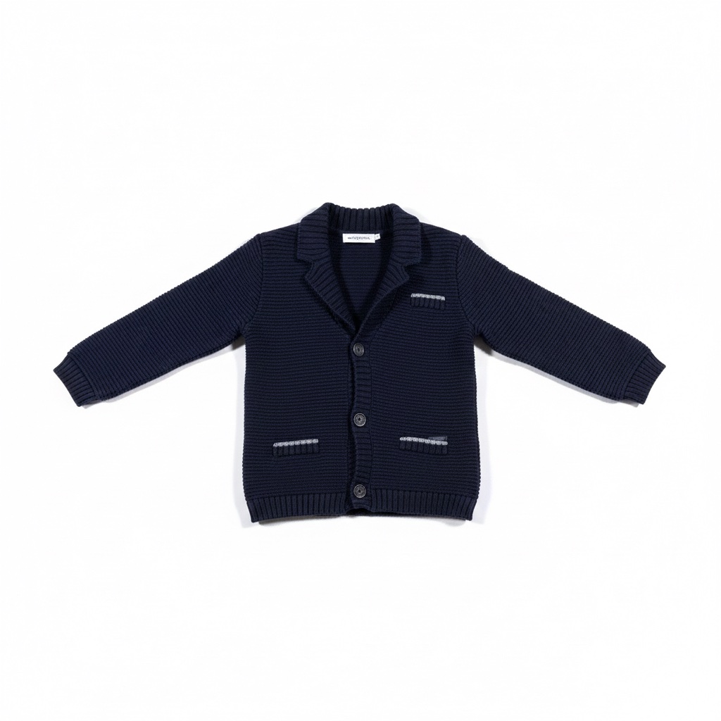 Gilet en tricot marine à larges côtes, style blazer. Fermeture par boutons, détails contrastés sur les poches. L’essentiel chic et douillet.