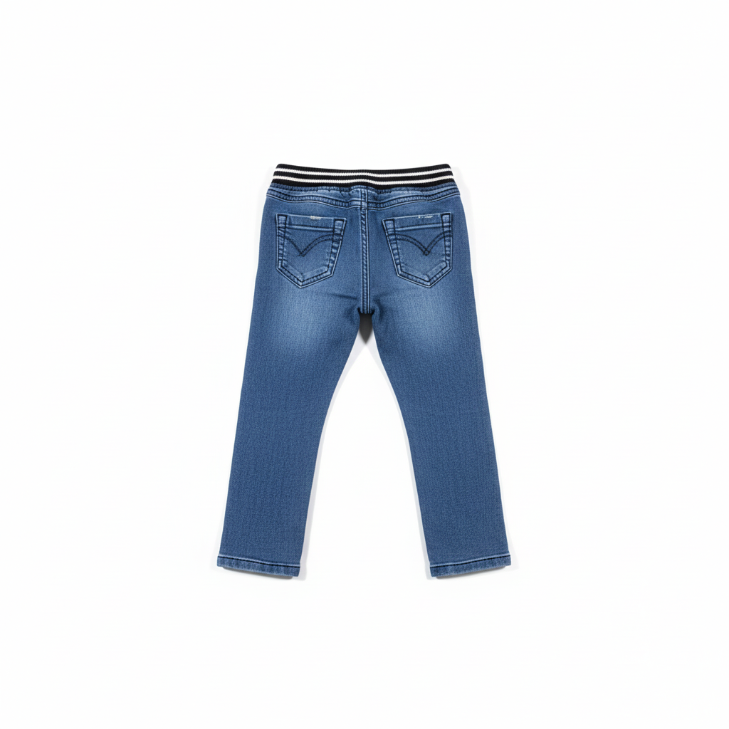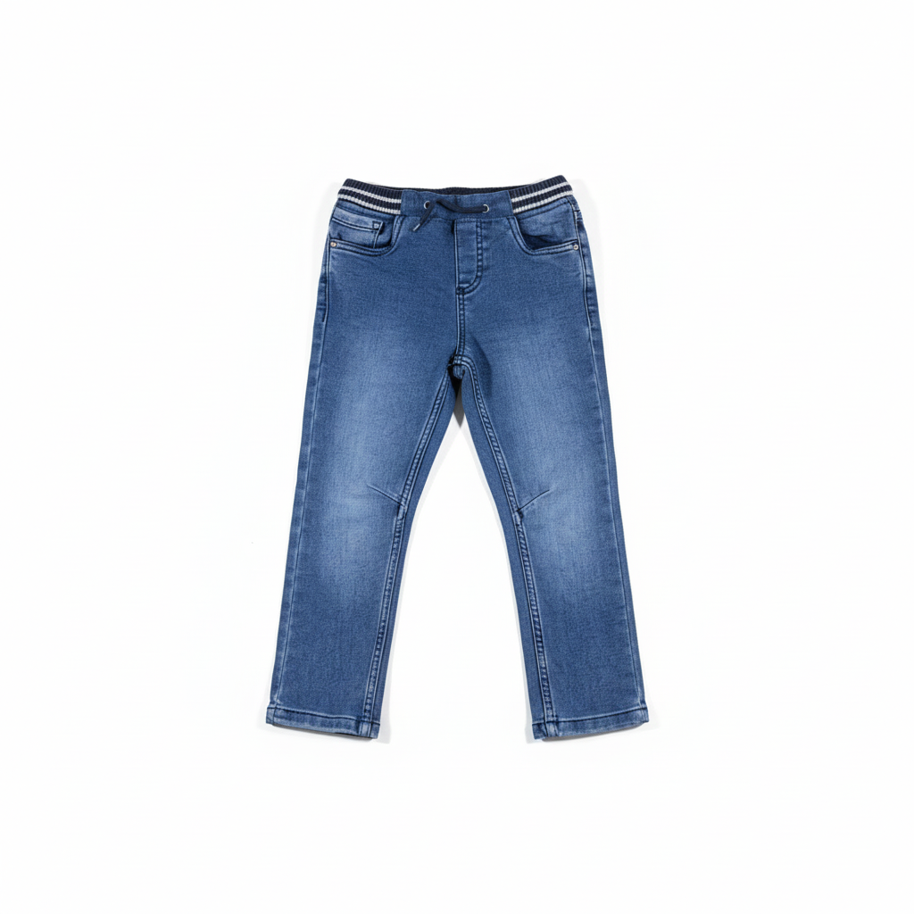 Ce jean bleu délavé allie style et confort avec sa taille élastiquée ajustable par cordon. Pratique pour le quotidien, il présente une ceinture contrastée à rayures et une coupe droite facile à porter.