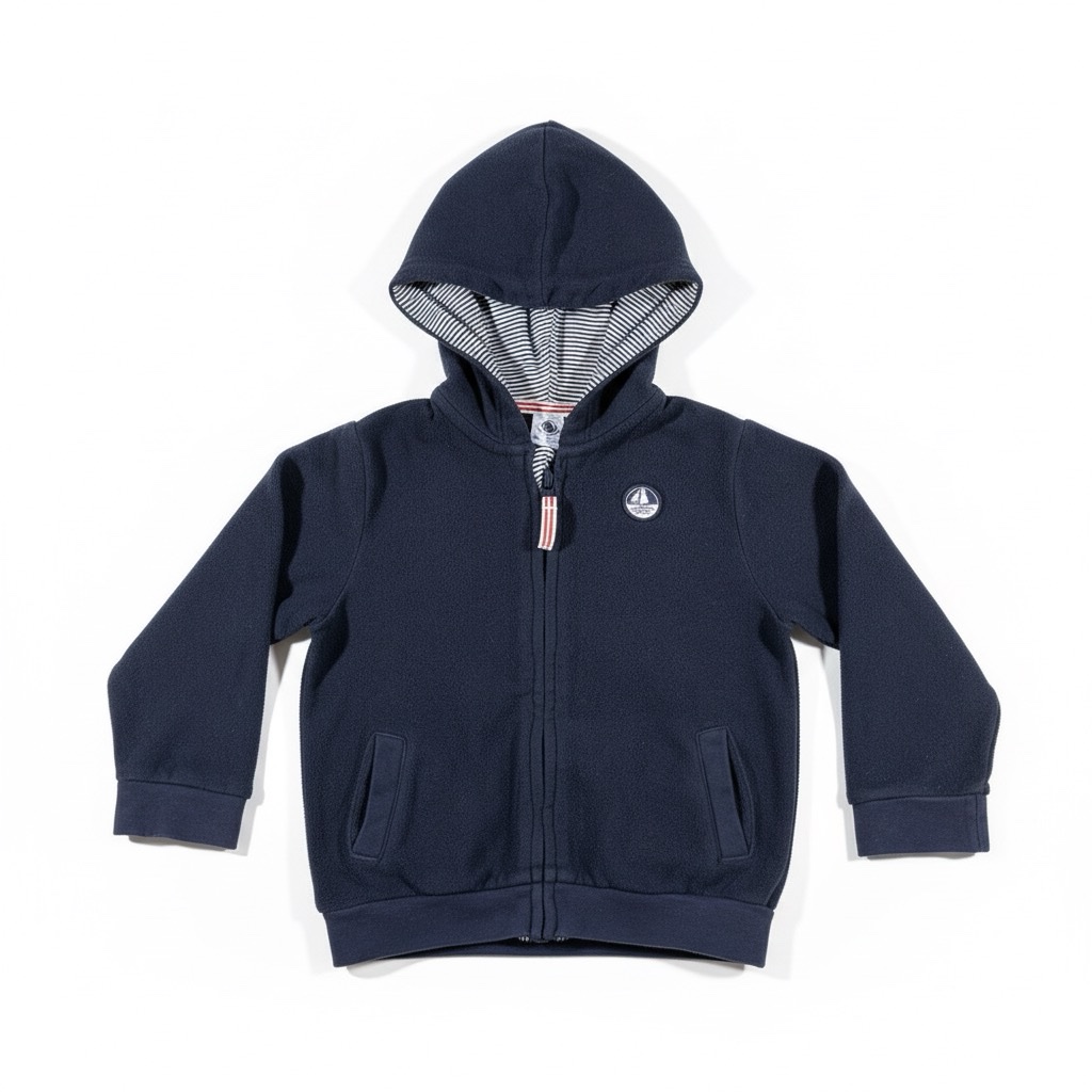 Une polaire zippée bleu marine, parfaite pour la mi-saison et l’hiver. Cette matière douce et respirante assure une chaleur optimale sans poids superflu. Capuche doublée de rayures pour un confort accru et deux poches pratiques.