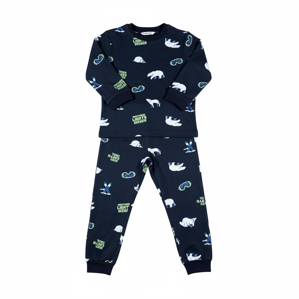 Pyjama à manches longues et pantalon à chevilles resserrées pour rester bien au chaud. Le tissu est doux et la taille élastiquée assure un confort maximal. Le motif thématique hiver/polaire apporte une touche d’originalité.