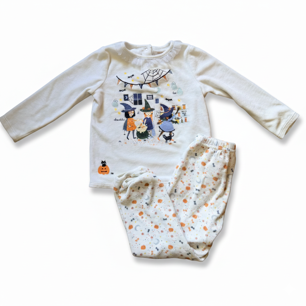 Cet ensemble pyjama sur le thème d’Halloween se compose d’un haut blanc à manches longues orné d’une illustration ludique de petites sorcières et d’un pantalon assorti à motifs citrouilles. Le haut est agrémenté d’un délicat col volanté en tulle, offrant une tenue de nuit à la fois thématique, douce et confortable.