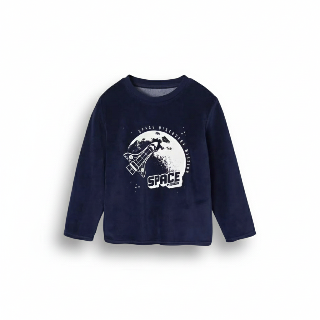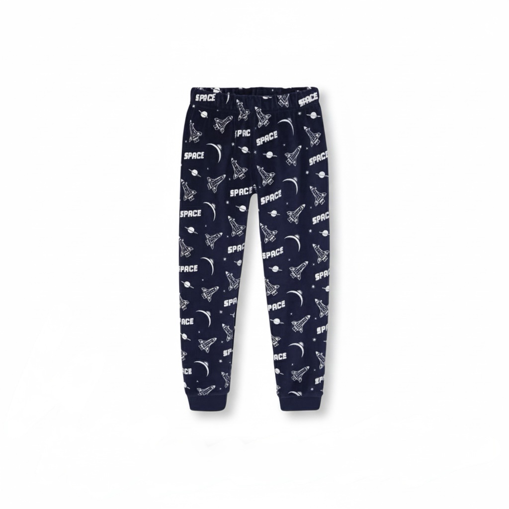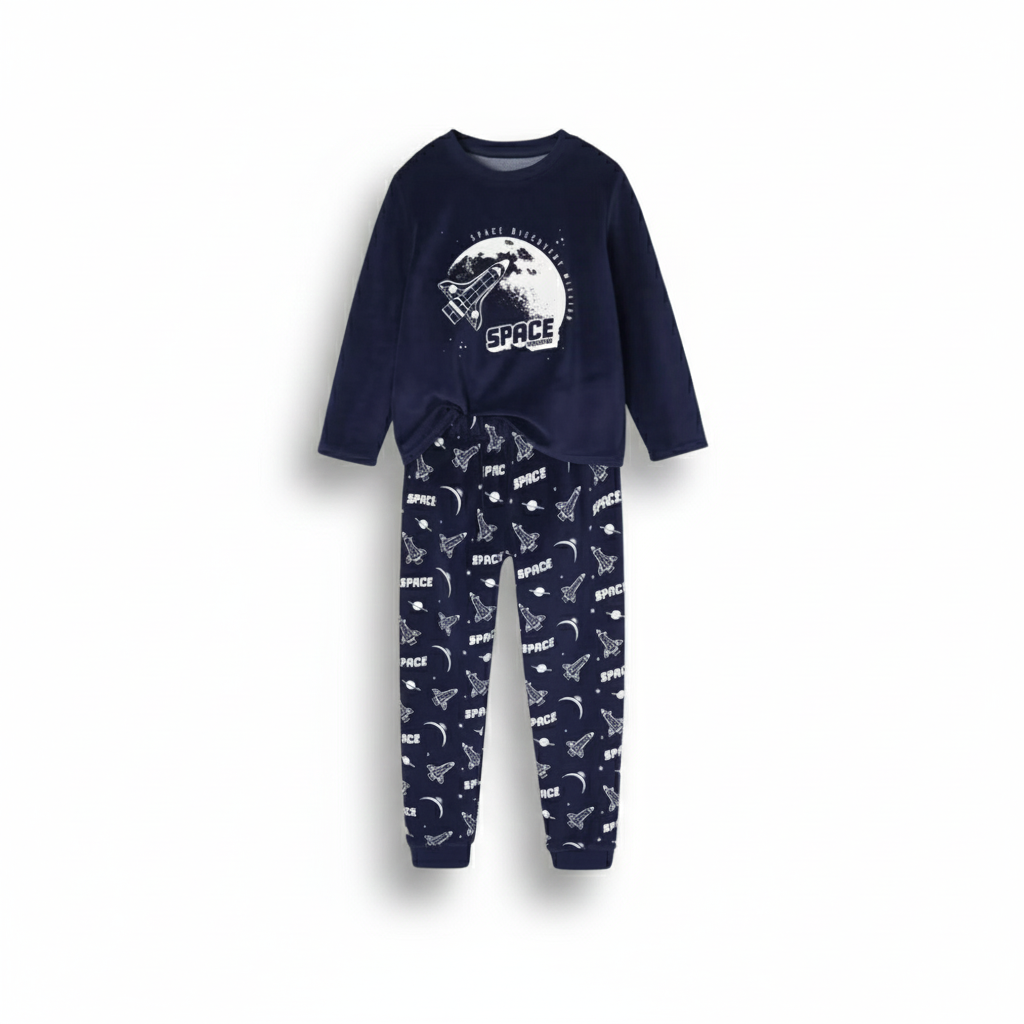 Pyjama deux pièces bleu marine à motif espace. Tout doux et confortable, il se compose d’un haut à manches longues et d’un pantalon assorti, idéal pour des nuits au chaud.