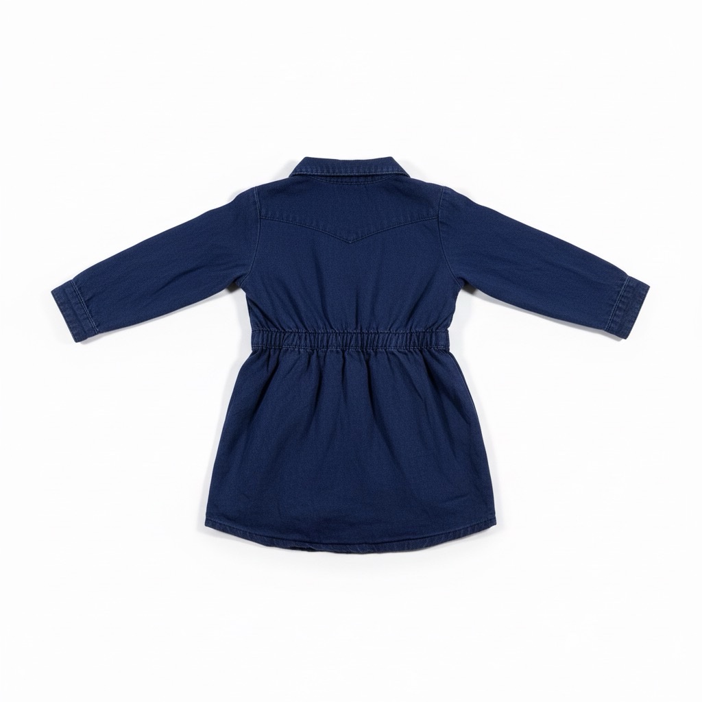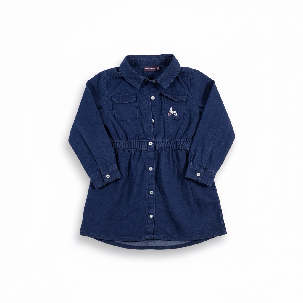 Robe Sergent Major bleu marine façon jean, à manches longues. À la fois pratique et pleine de charme, elle offre un look décontracté mais toujours chic, parfait pour le quotidien comme pour les sorties plus habillées.