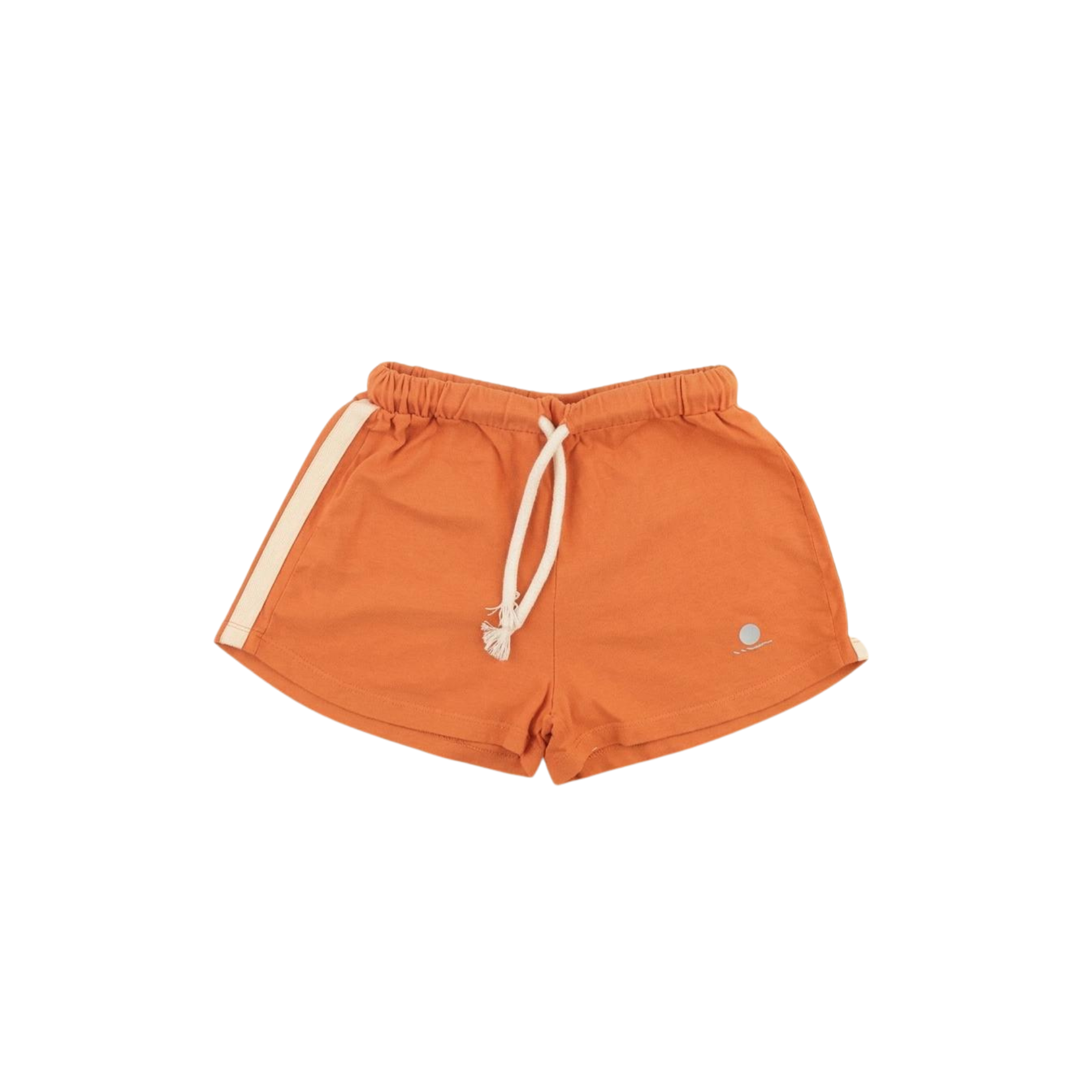 Ce short de sport d’une couleur orange terre cuite dynamique présente un style rétro et athlétique. Il se distingue par ses bandes latérales contrastantes de couleur crème et sa coupe courte aux bords légèrement arrondis. Pour un ajustement parfait, il est doté d’une taille élastiquée avec un cordon de serrage blanc en cordelette.