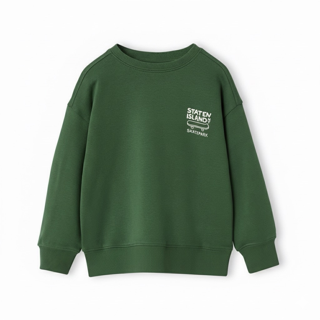 Ce sweat-shirt confortable de couleur verte présente une coupe décontractée et des bords-côtes aux poignets et à l’ourlet. Il est orné d’un motif simple sur la poitrine.