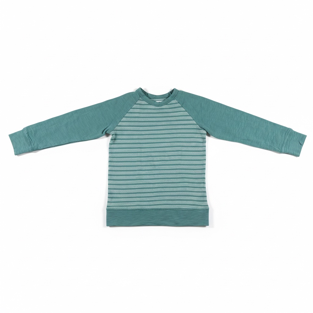 T-shirt à manches longues vert d’eau, rayures douces et manches raglan. Confortable, doux et parfait pour un look relax.