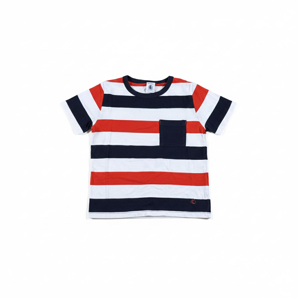 Ce t-shirt à manches courtes affiche un style dynamique avec ses larges rayures tricolores (blanc, rouge et marine). Conçu pour le quotidien, il est muni d’une petite poche poitrine contrastée bleu marine pour une touche de style supplémentaire.