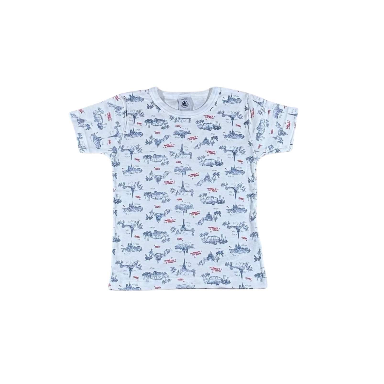 Ce t-shirt à manches courtes blanc de la marque Petit Bateau est orné d’un imprimé intégral délicat représentant des monuments de Paris, comme la Tour Eiffel, ainsi que des petites inscriptions rouges. Confectionné dans le coton doux emblématique de la marque, il possède un col rond classique et une coupe droite confortable, parfaite pour un look frais et ludique.