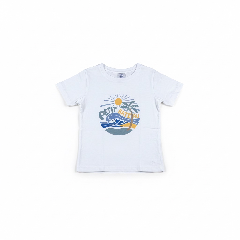 Un t-shirt blanc en coton emblématique de Petit Bateau, connu pour sa douceur. Le motif central, esprit plage et surf, invite à l’évasion. Parfait pour un look estival confortable. Un incontournable pour les jeux d’été !